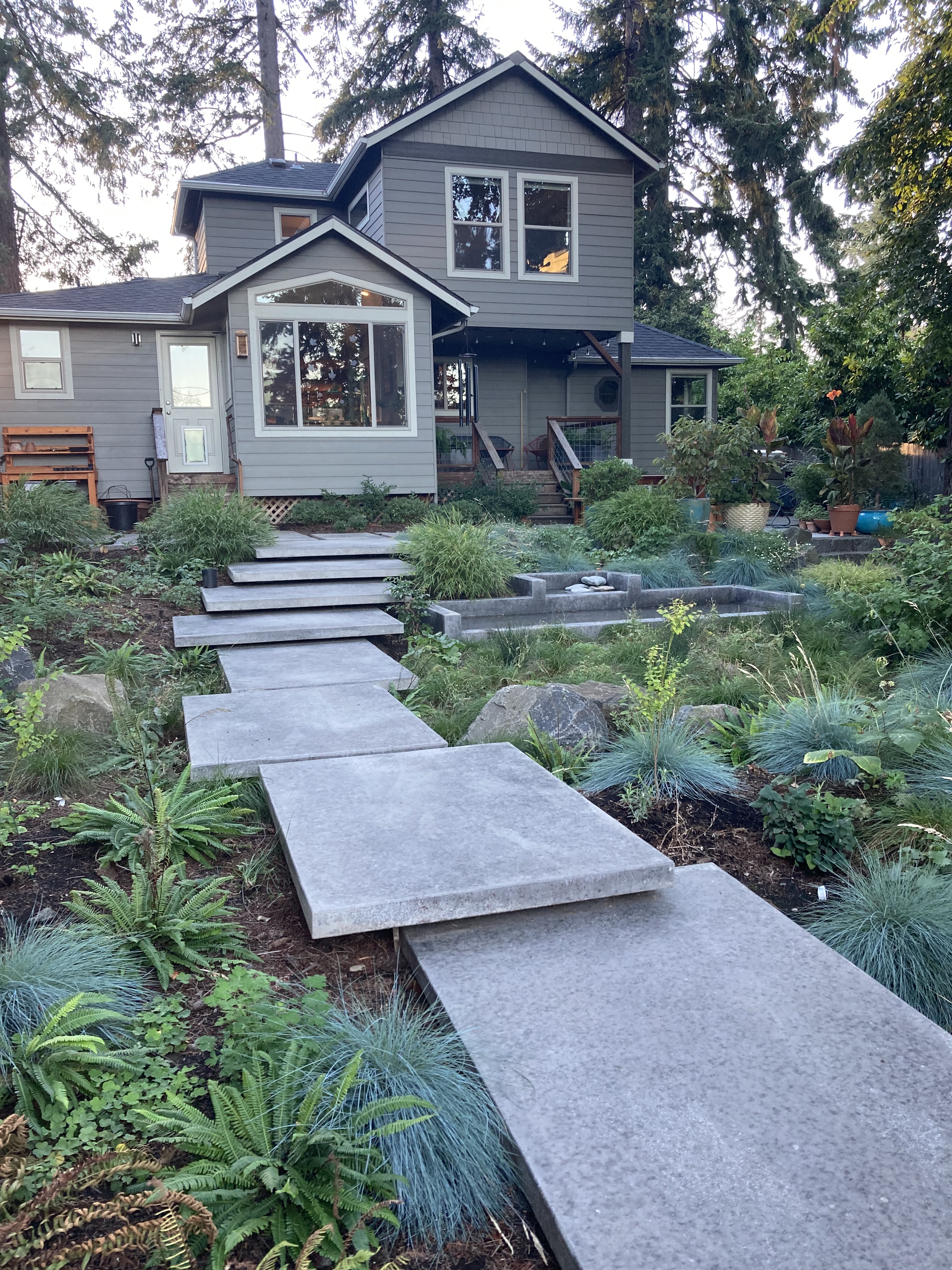 Concrete pads, groundwater recharge and a wildlife bath were a few of the design guidelines for this backyard bog set amongst large Douglas Fir trees