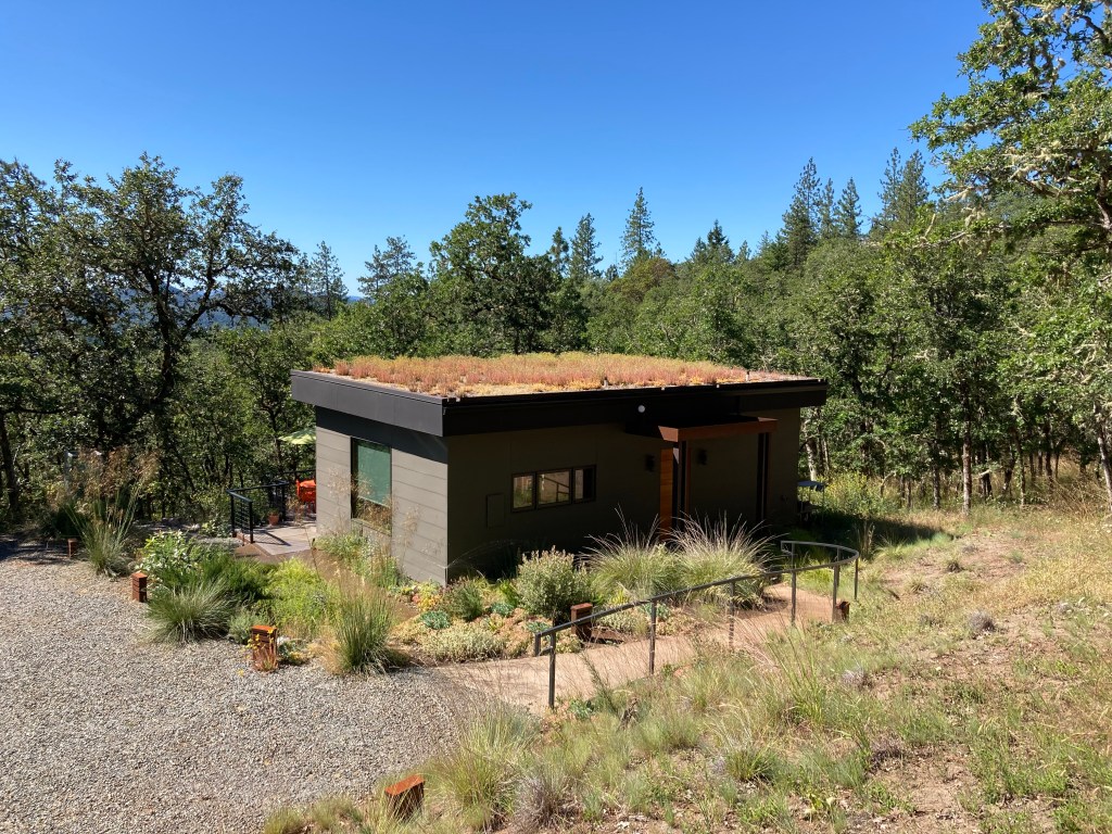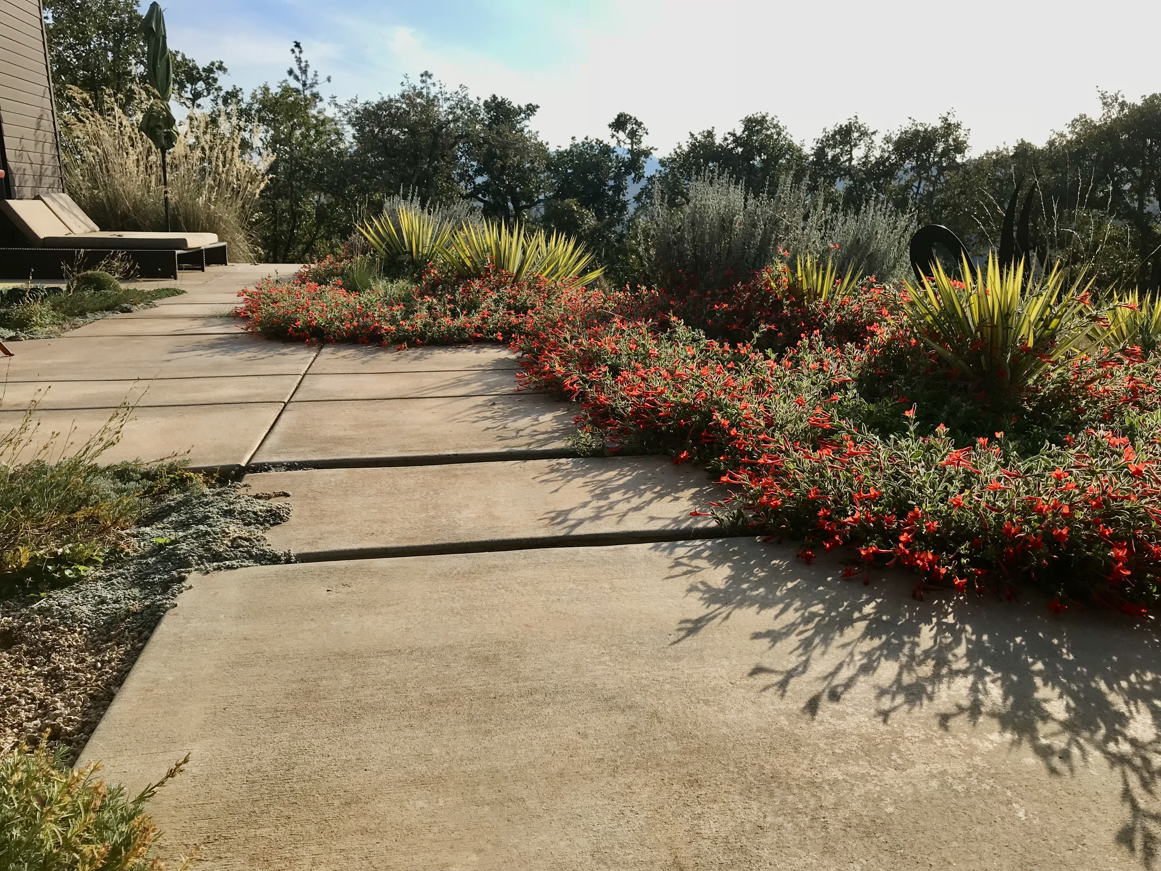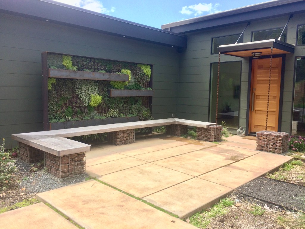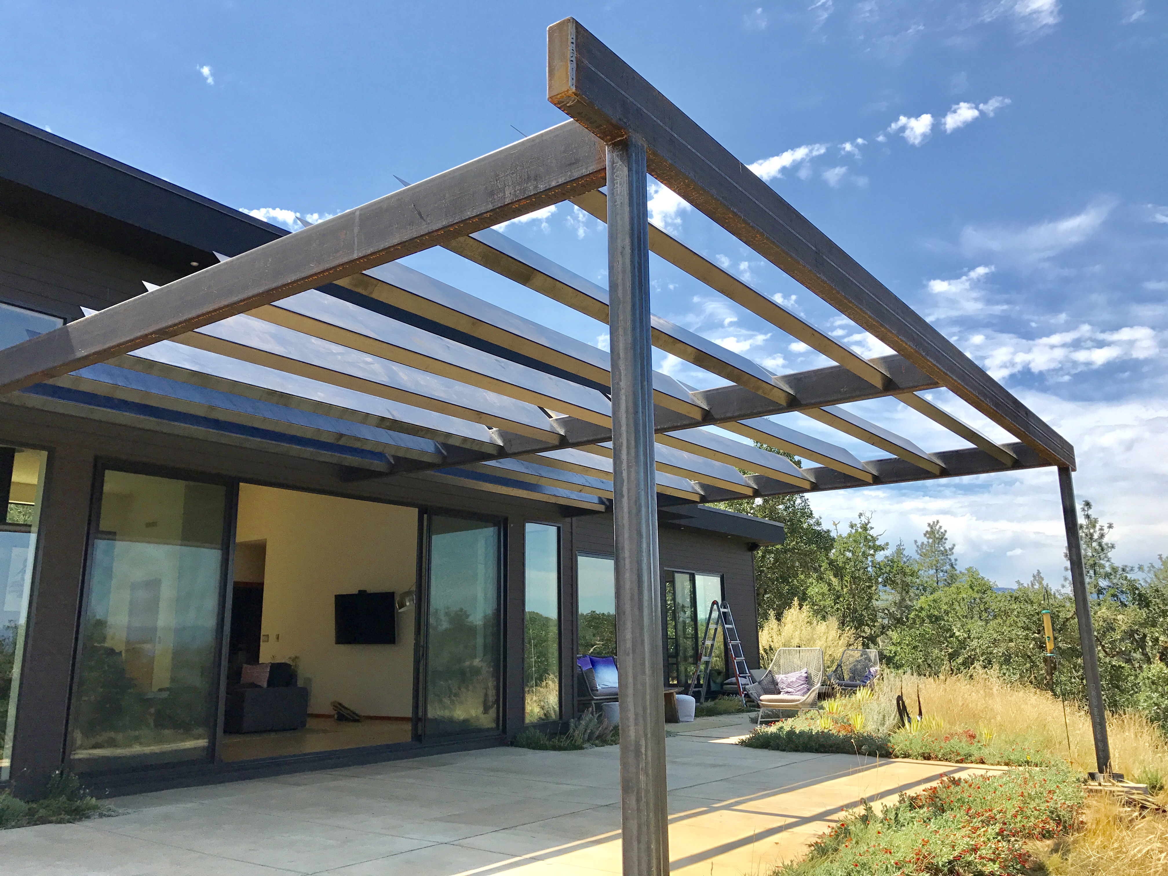 a design rendering of the sitea louvered shade pergola creates an outdoor room.a sun drenched patio ringed with California fuchsia has a view to the mountains.re-purposed tube steel lighting, drought adapted plantings, a green roof and a vertical planter blend into Pazo’s rugged character.