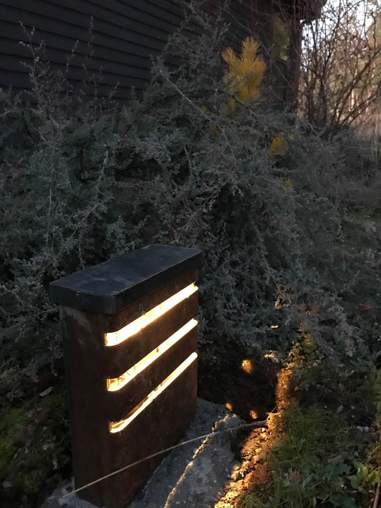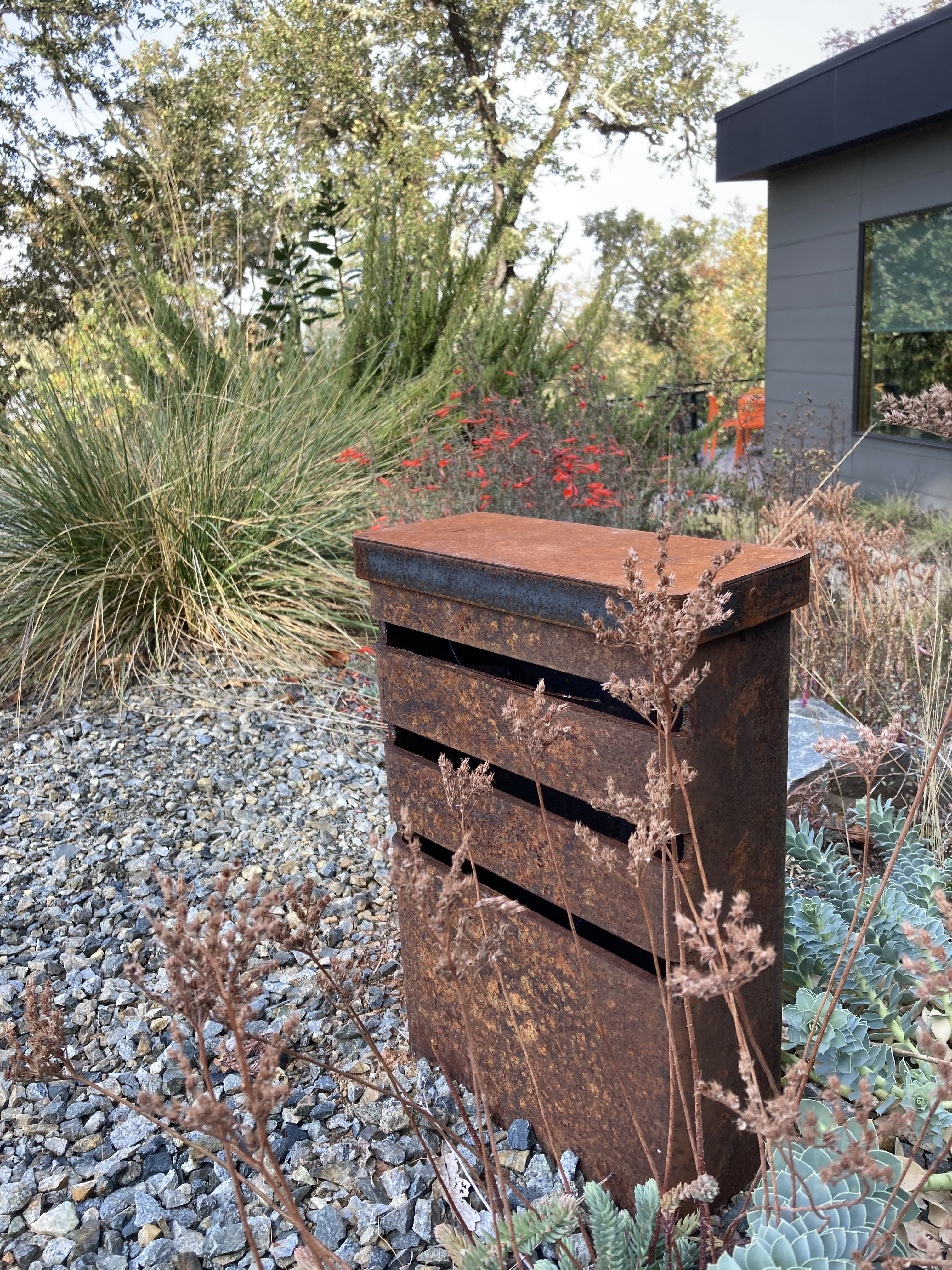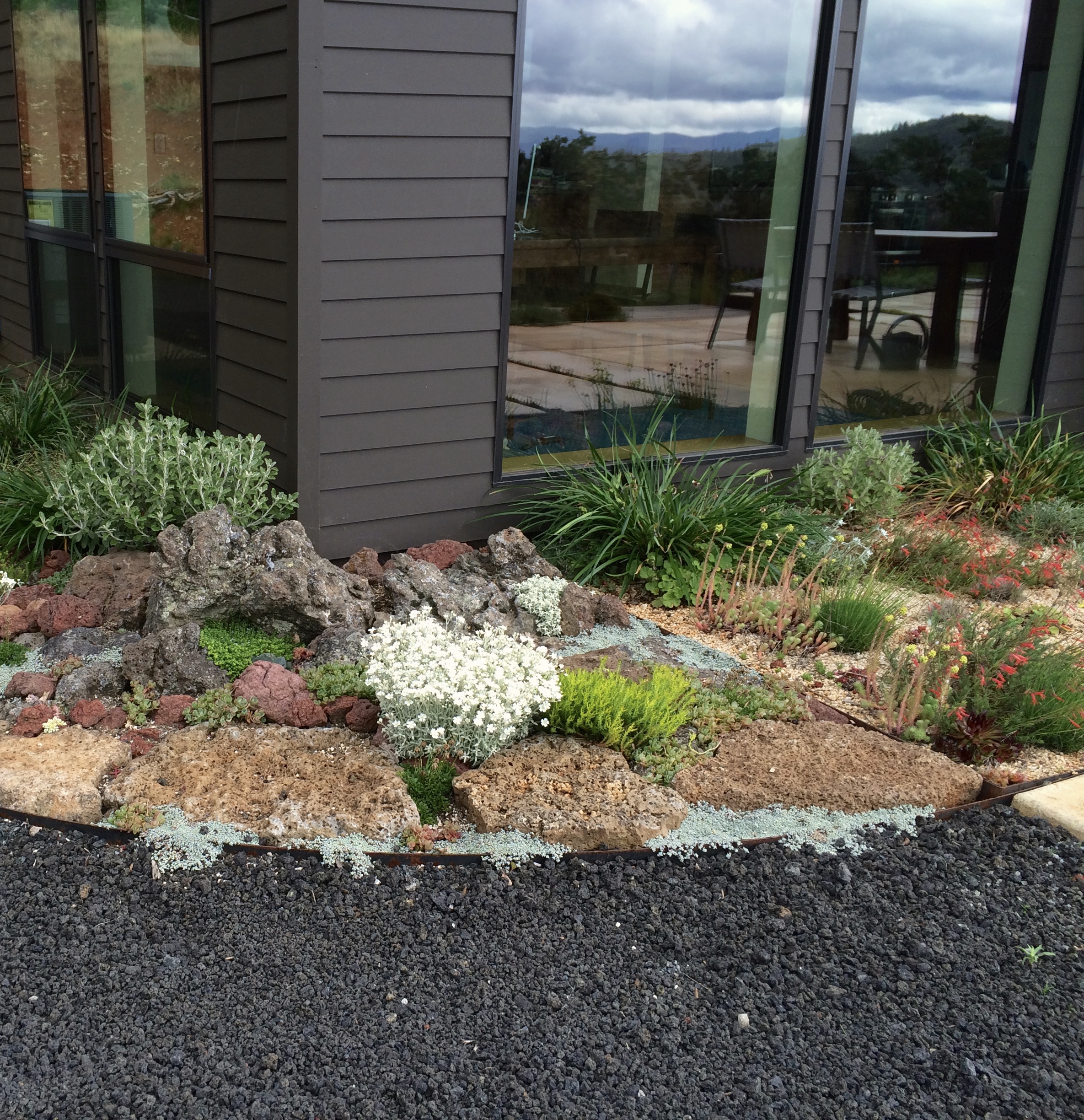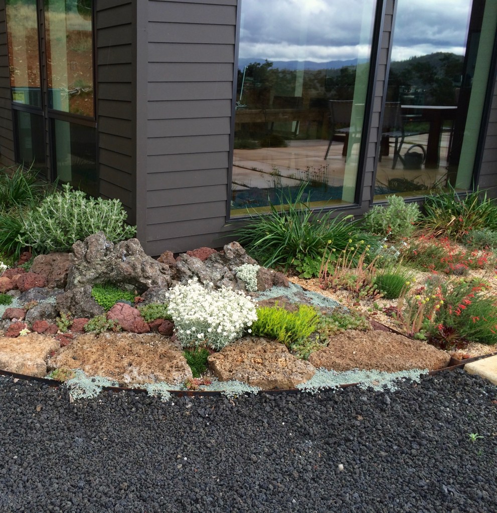 a design rendering of the sitea louvered shade pergola creates an outdoor room.a sun drenched patio ringed with California fuchsia has a view to the mountains.re-purposed tube steel lighting, drought adapted plantings, a green roof and a vertical planter blend into Pazo’s rugged character.